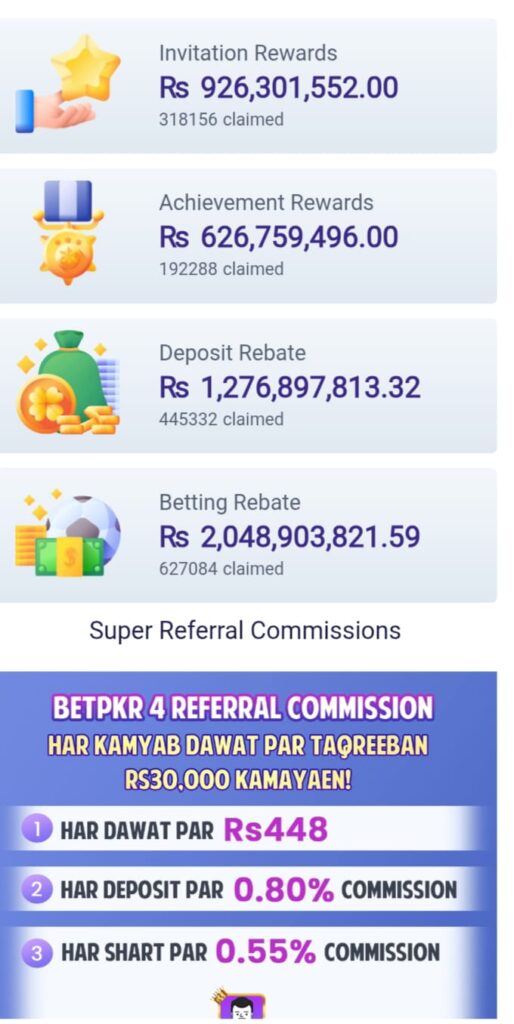 Users may earn rewards by inviting friends to join BetPKR using referral links.
